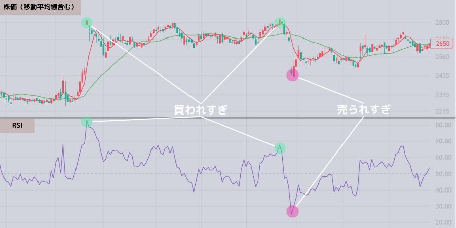 0~100で指標は示され、数値が高いと買われすぎ、数値が低いと売られすぎを表します。