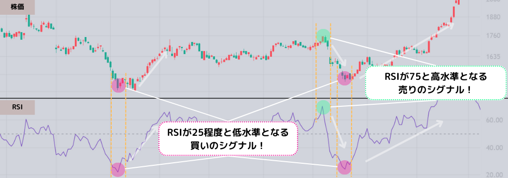 RSIが70以上となったときの「買われすぎ」、30以下となったときは「売られすぎ」といった指標を活用し、