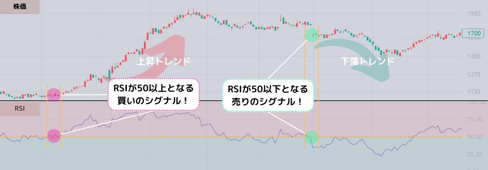 RSIが50以上で推移している場合は、上昇トレンドとして買い、50以下で推移している場合は下落トレンドと判断し売りを行う順張り手法です。