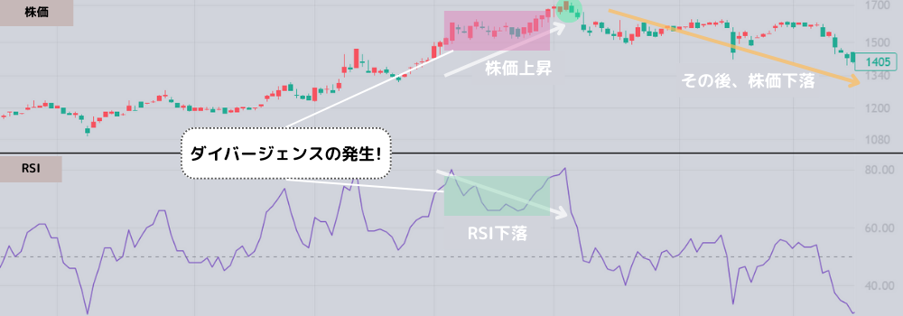 価格が上昇しているにもかかわらず、RSIが逆の下落方向を向いている場合、